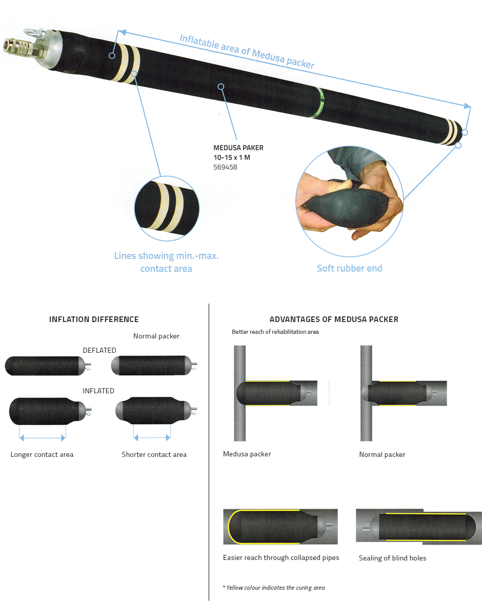Endene på Medusa-packers er laget av spesiell og ekstremt fleksibel myk gummi, noe som forenkler håndtering av packer i mindre plasser . Siden packers toppen kan skyves nærmere rørkanten, blir T-tilkoblingsreparasjoner mer effektive.
