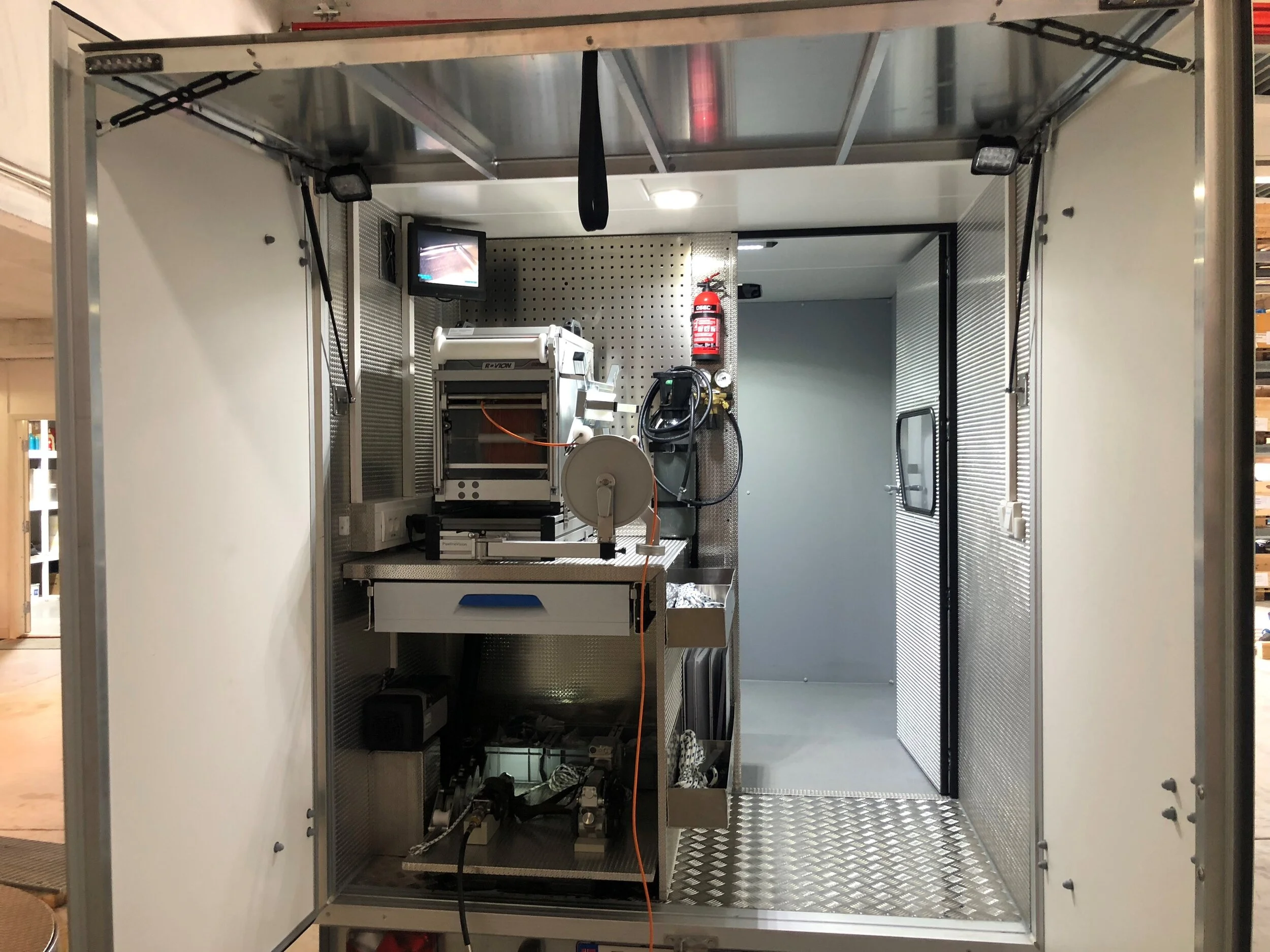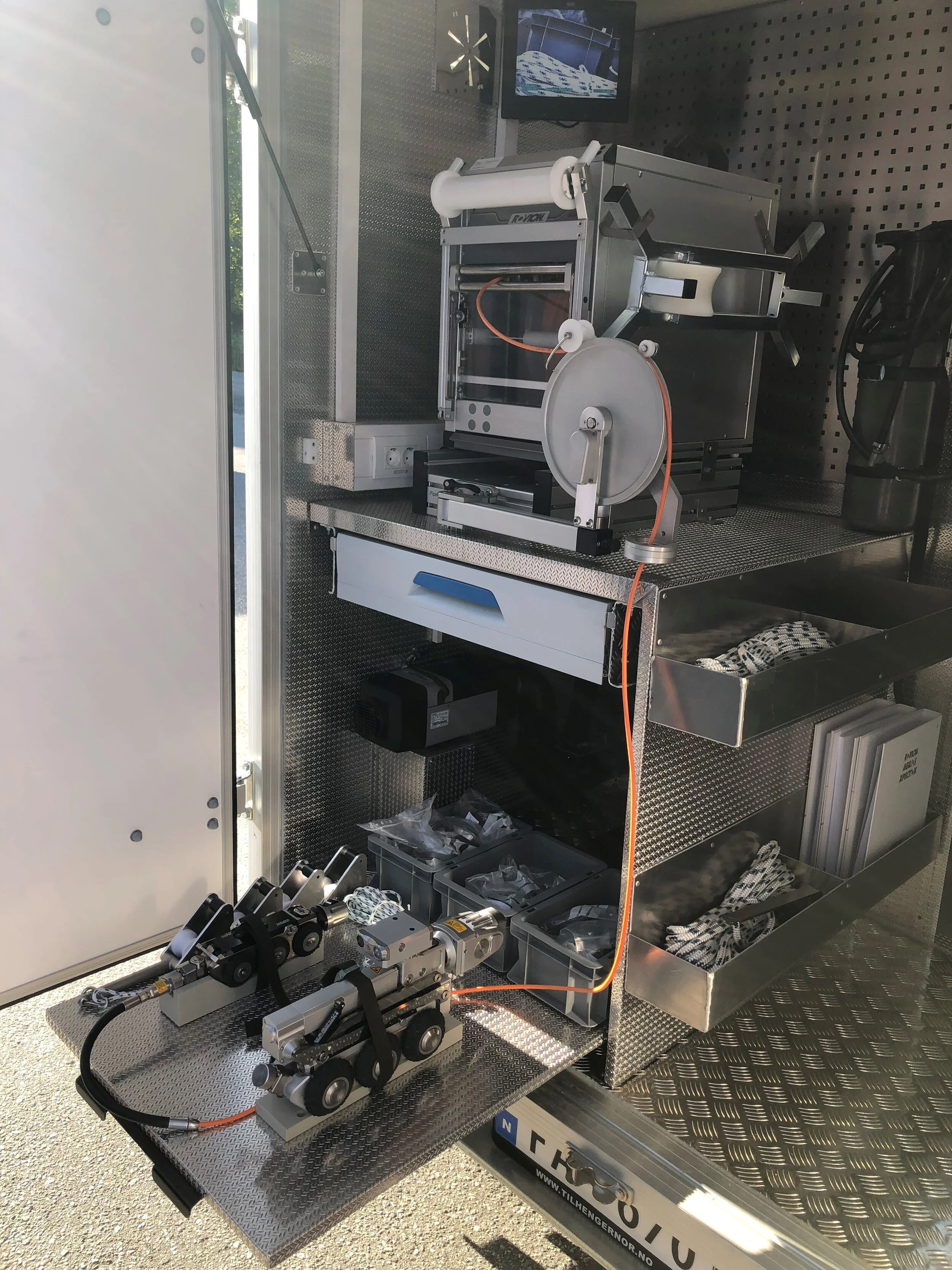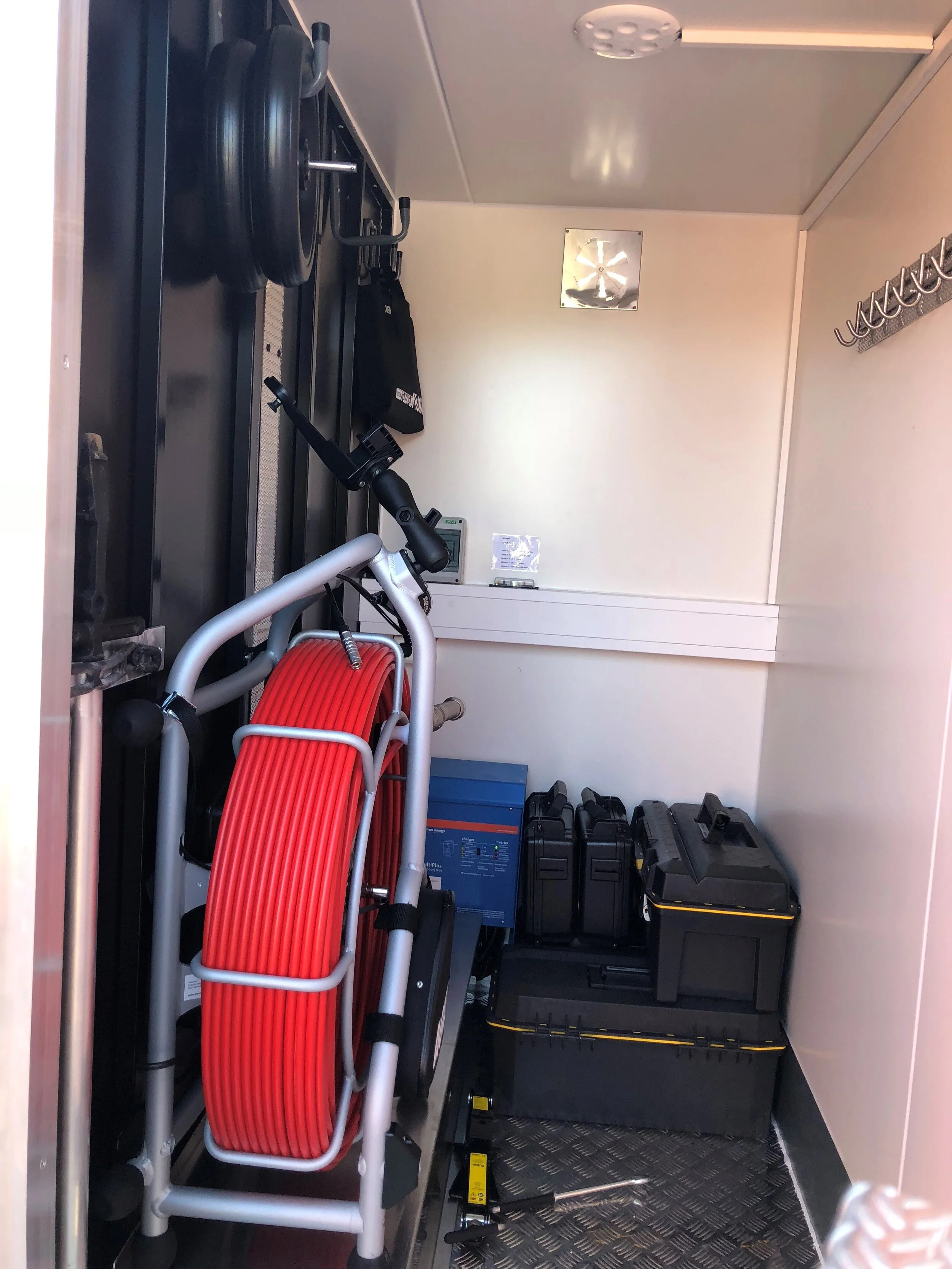 Rørinspeksjonshenger 12,2m³ 3,66x1,75m 2,6t -med iPEK Rovion system med 300 m kabeltrommel, flere traktorer, kamerahoder og Agilios stakekamera.